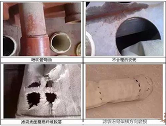 濾袋袋口部位破損多在袋口向下30-40公分以內,多表現為濾料底層吹破、脫落。多為壓縮空氣過高、噴吹管歪斜、花板變形等原因造成,在安裝過程中要注意安裝的質量。