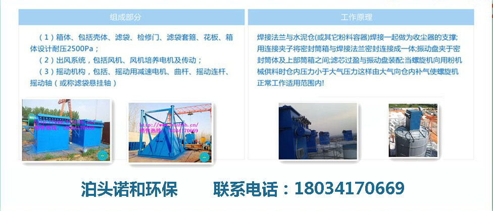 倉頂除塵器是一種方形可拆的金屬柜,底板上有24個嵌入圓形孔,它設有24條起毛呢絨制造的立式濾袋,分三組(每組8個)分別扎緊在上端3個振動器的吊架上,定時分別拉動三組吊架的牽動手柄,使濾袋阻留下來的灰塵降落在倉頂除塵器的方形金屬下端的料倉